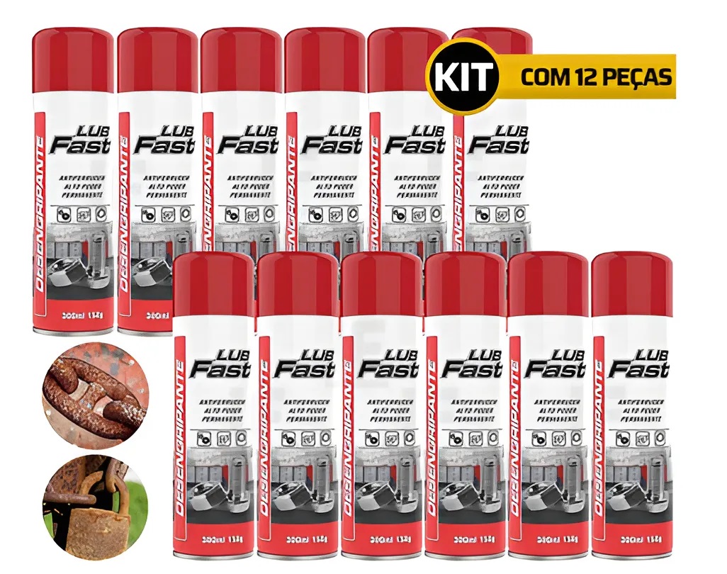 Este kit inclui 12 unidades do Lubfast Óleo Protetivo Desengripante de 300ml cada, proporcionando estoque suficiente para diversos usos ou equipes de manutenção.